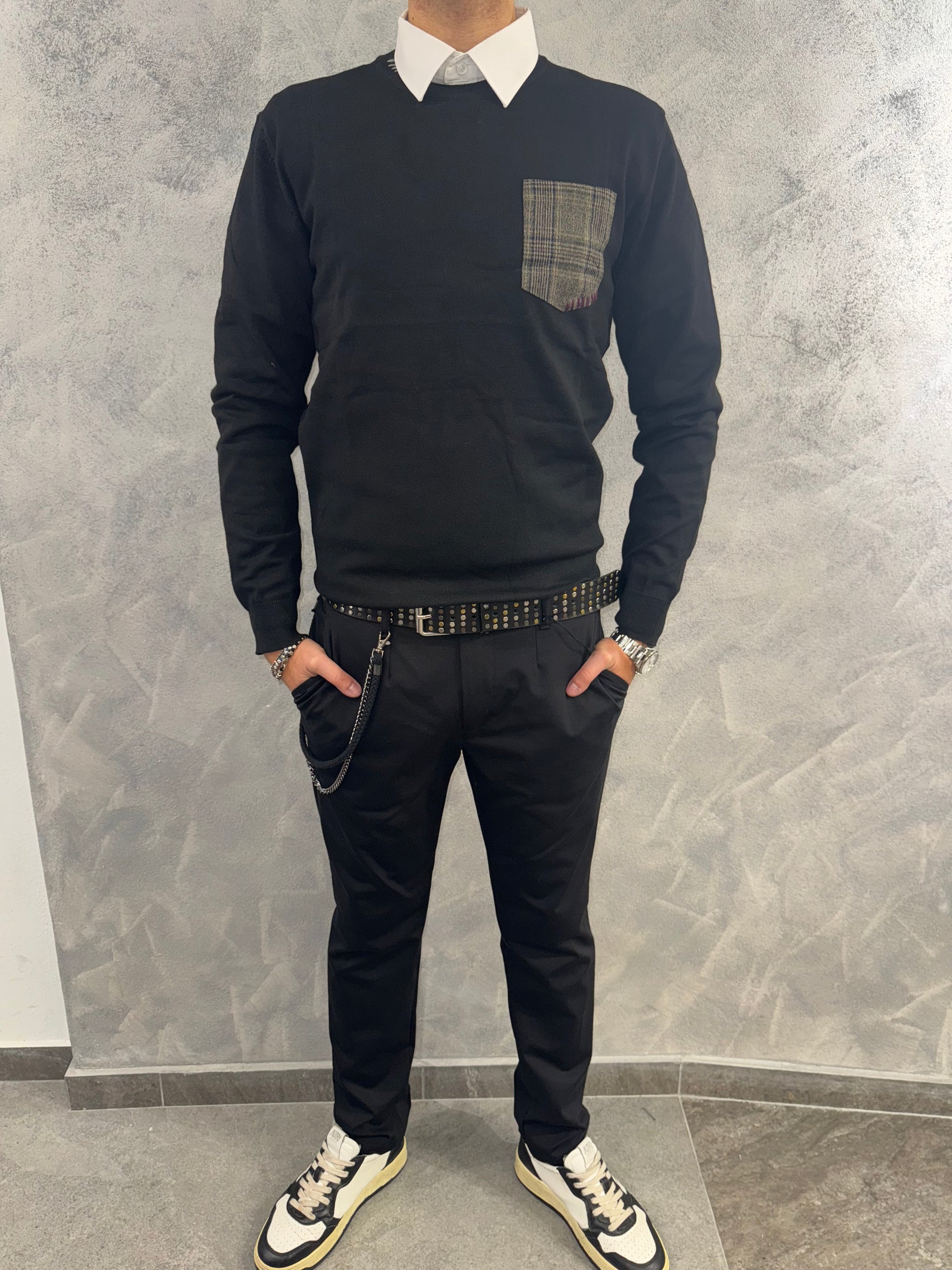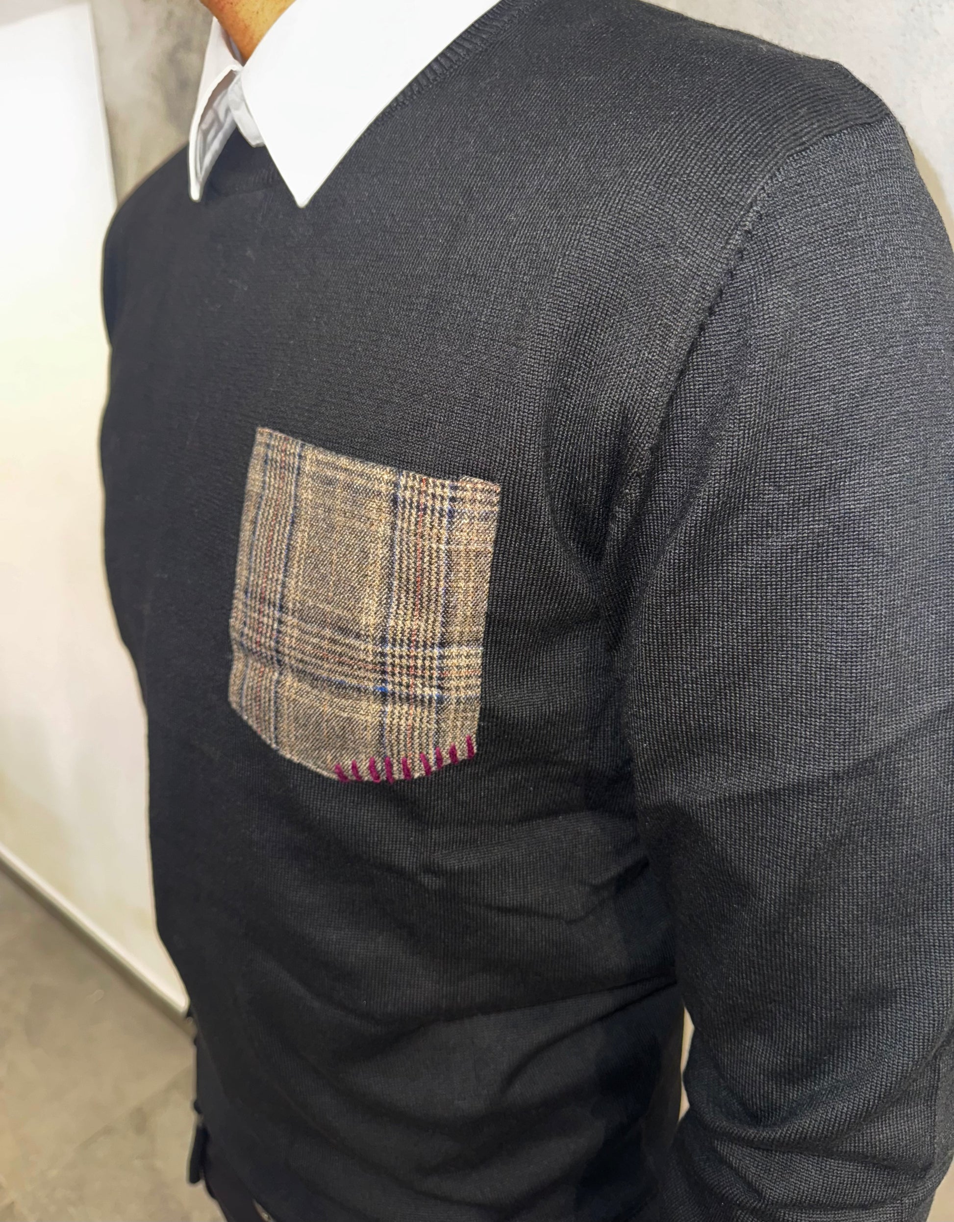 Questo maglioncino nero è perfetto per chi cerca un look classico con un tocco di personalità grazie alla tasca a righe quadri. Realizzato con materiali di alta qualità, è comodo e resistente, ideale per le fredde giornate invernali. Rendi il tuo outfit unico con questo elegante maglioncino con tasca a quadri.